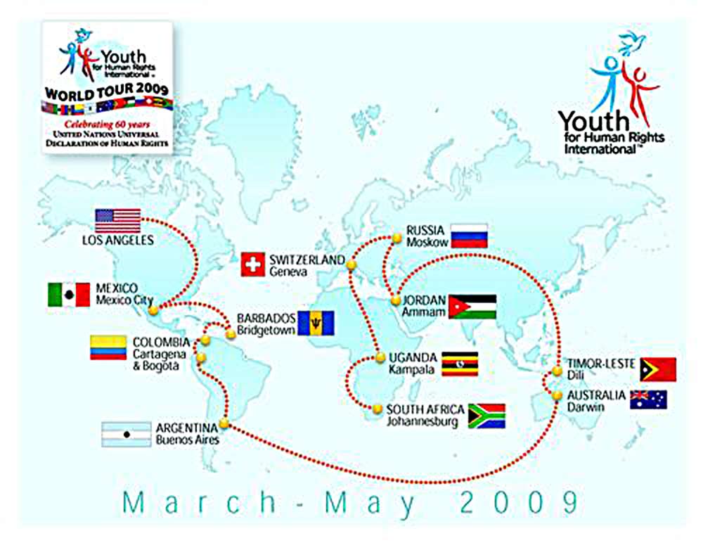 YHRI’s verdensturné i 2008 gik Jorden rundt gennem Haiti, Venezuela, Marokko, Nigeria, Kenya, Ægypten, Pakistan og Taiwan. Medierne fulgte med og fortalte historien om de honoratiores, embedsmænd, religiøse og lokale ledere og unge, som de besøgte. Der blev skabt nye venskaber og opbygget et samarbejde for at få undervisningen i menneskerettigheder op på et helt nyt niveau.